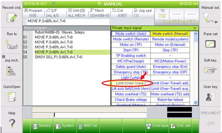 If the limit (overtravel) item is displayed in yellow, it means that the hardware limit switch is in operation (open); in other words, the robot deviated from the hardware operation area..