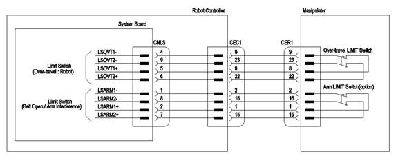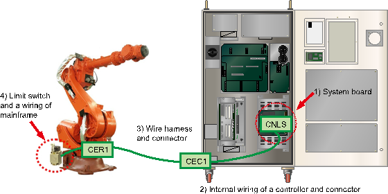 Understanding the wiring structure is required to find out the cause among the components related to the limit switch. As shown in the following figure, the limit switch is connected from the limit switch inside the mechanical main body, through a cable, to the system board inside the controller.