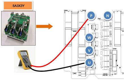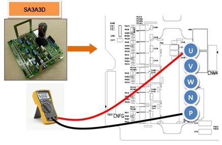 Switch device of Servo Drive Unit switches the direct current voltage that supplied from diode module and output the alternating current for each phases. If a short circuit occurs at the internal terminal of switch device, over-current flow and it will cause an IPM fault error. Please remove the connector and check if a short circuit has occurred between the output terminal in a switch device of Servo Drive Unit and the P (or N).