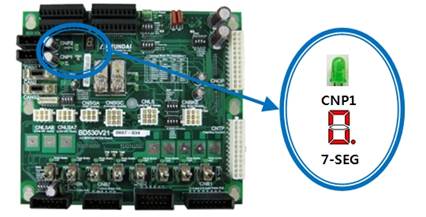 Please check if a power is being supplied or not by using a simple method. As a below diagram, there are LED CNP1 that indicates DC 5V voltage and 7-segment that indicates the board operating status on an upper right side of System Board.