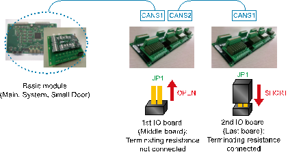 If numbers of boards are connected to each other, a terminal resistor must be handled clearly. CAN data communication uses daisy chain method. So the terminal resistor only should be connected to the last CAN communication cable and the terminal resistor must not be connected to any boards in between. Terminal resistor’s connection uses a JP1 jumper that located next to the CANS1 and CANS2 connector on a board. If JP1 has been shorted it means that the terminal resistor is connected, and if JP1 has been opened, it eliminates the terminal resistor connection. Please refer to the following Figure.