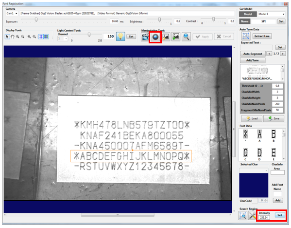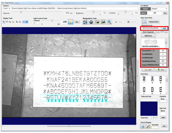 Click the [Extract Line] button to automatically extract characters in the defined area according to currently defined character recognition variables. If all characters are not recognized in the area as follows, change the OCR variables to recognize all characters. In this example, the [Char Min Width], [Char Min Height], [Char Min Num Pixels], and [Fragment Min Num Pixels] variables are changed to recognize “1” and “-.”
