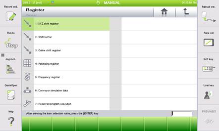 (1) Selection 『[F1]: Service』 → 『2: Register』. The register menu screen will be displayed as shown below. Detailed configuration of the menu will vary depending on the setting of the robot.